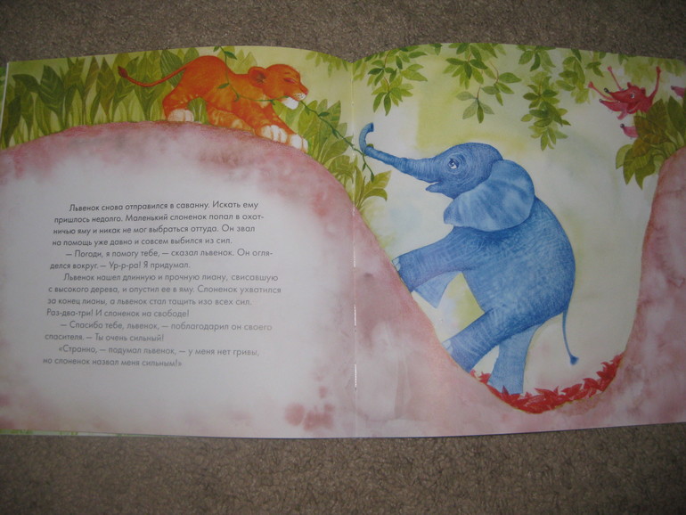 Трогательная история, есть что обсудить с ребенком - доброту, помощь другим, да и вообще много всего. Когда мы читали эту книгу в 2 года то обсуждали в основном картинки, названия животных, где они живут и т.д. А сейчас в 3 года ребенка интересует почему слоненок упал в яму, почему он не мог сам вылезти, почему львенок ему помог и т.д.