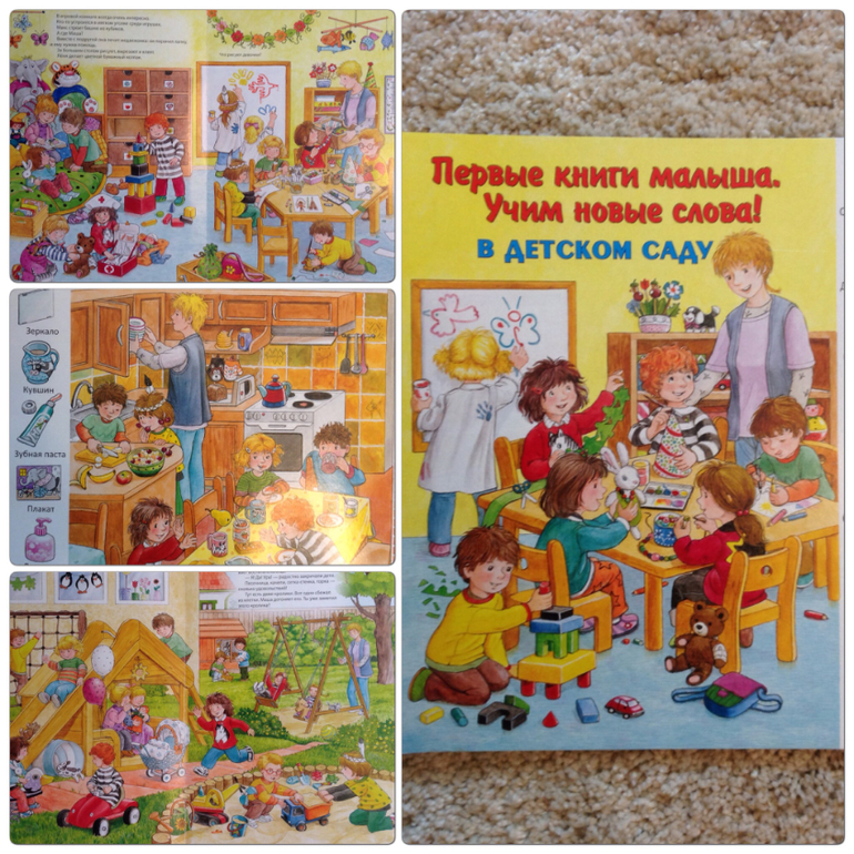 Книга-виммельбух о детсадовских буднях. Текст, если честно , в книге мне не очень нравится, да его там и немного . Мы любим с сыном просто рассматривать картинки и искать предметы, нарисованные отдельно на полях. Рисунки очень детальные, на каждом развороте представлена одна из сторон жизни в детском саду - сон , прогулка , обед, совместные игры .