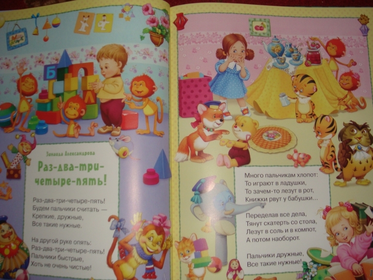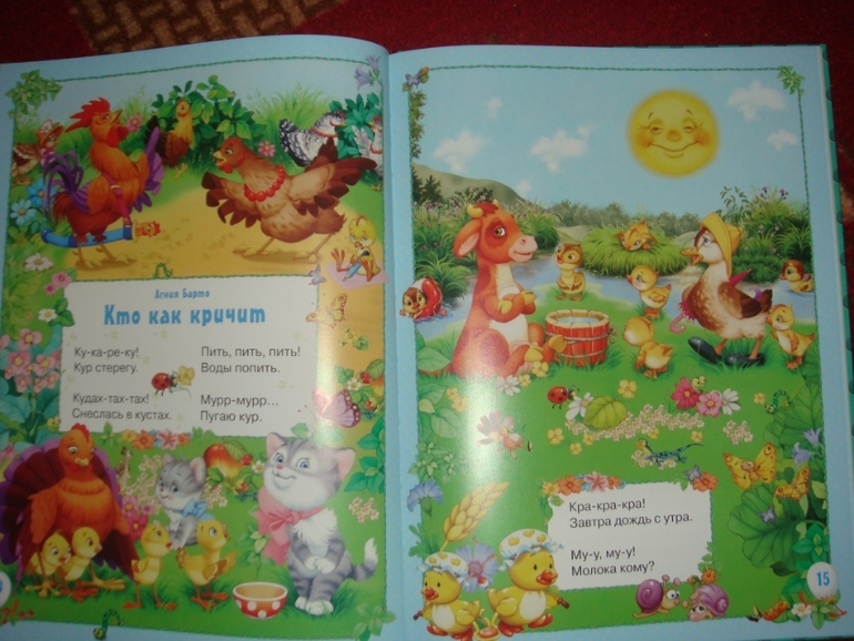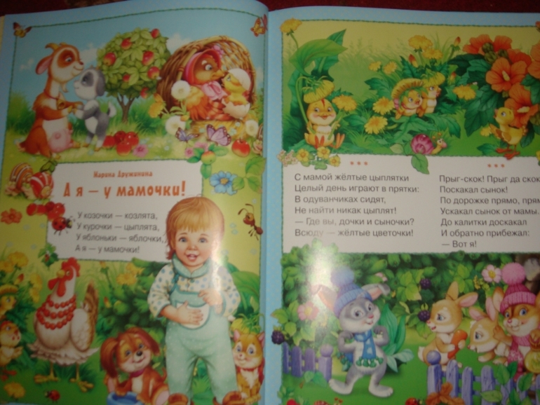 На обложке такая картинка, что если книгу наклонять туда-сюда, то картинка оживает. Знаете, раньше такие открытки были. Дальше открываем книгу, а там....Может я просто как сорока бросаюсь на все яркое. НО книга действительно очень сочная, яркая, красочная. Я просто в восторге. Моя Лиза тоже долго ее листала, очень ей понравилась. В книге собраны сказки и стихи для самых маленьких: репка, колобок, стихи Барто, З.Александровой, Циферова и.т.д