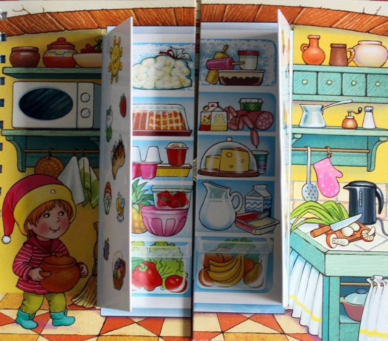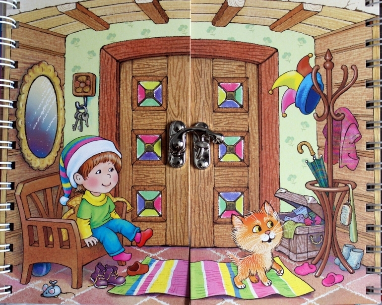 Книга из плотного картона, красочные, понятные рисунки.Ребенок может по-долгу "изучать" каждую комнату.. В книге три металлических замочка, первый - самый крепкий, остальные открываются легко. из-за пружинного крепления страницы постоянно двигаются, из-за этого и закрывать замочки сложнее. Вообще очень хорошая книга. Аналог знаменитой доски с замочками. 5 разворотов, 5 замков (не считая того, что на обложке). Дверцы "холодильника" магнитные. Каждый разворот-комната, есть стих про эту комнату. Картинки красочные, много деталей. РЕКОМЕНДУЮ!
