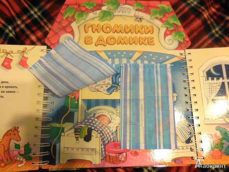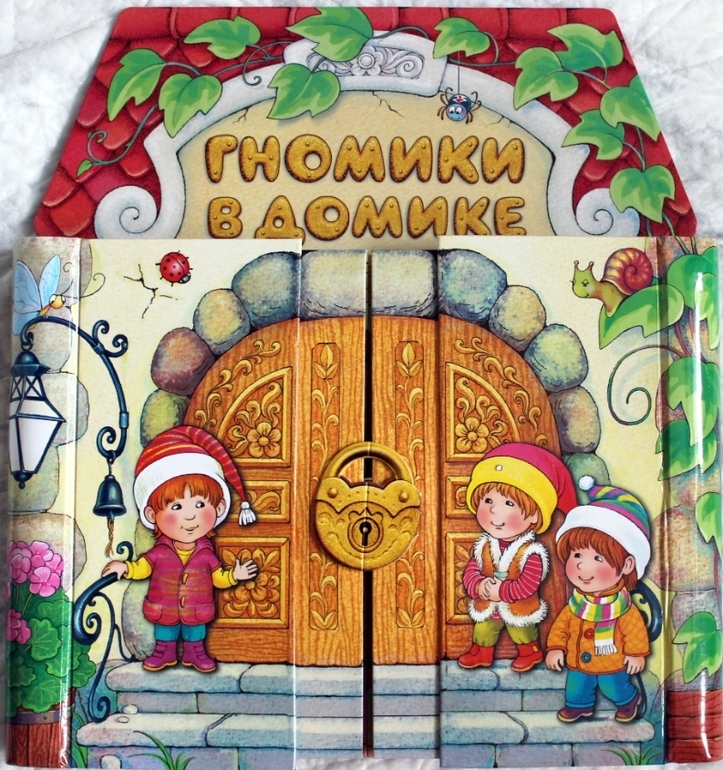Малышам от 0 до 3"Гномики в домике" книжка-тренажер, сделанная в виде сказочного домика, в котором каждому помещению (кухня, кладовка, игровая, гостиная, спальня) выделен свой разворот, с дверями, замочками, магнитными дверцами (холодильник) и занавесочками..