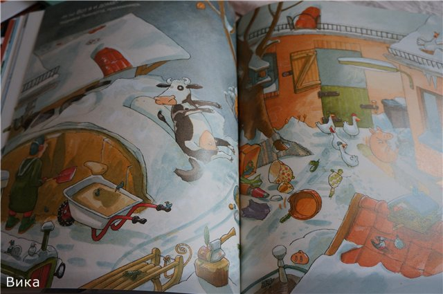 Книга очень добрая, озорная, юморная и очень позитивная! Картинки большие. на весь разворот. Есть много мелких деталей. которые очень интересно рассматривать: самые внимательные увидят. как в ожидании подарков висят на веревке куриные носочки. (в конце книги в этих носочках будут лежать колоски и червячок :) ), или увидят забинтованную лапку у курицы. Причем первая и последняя картинки книги - это одно и тоже помещение. И любопытно сравнить что изменилось, как украсили помещение и т.д.