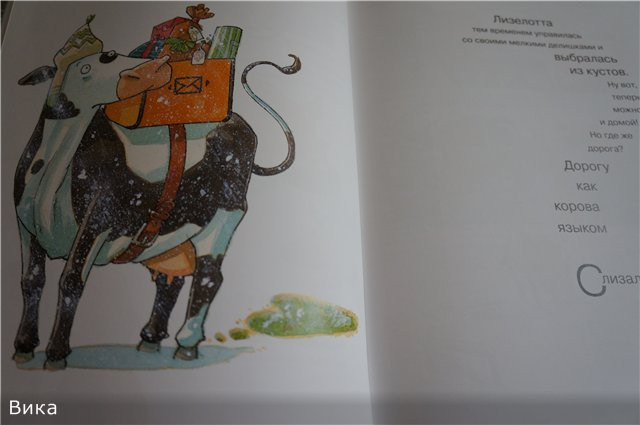 Лизелотта- почтовая корова. Вместе с почтальоном они развозили подарки. Закончив свою работу они распрощались. Лизелотты должна была передать подарки для обитателей хутора от почтольона. Перед дорожкой она решила "забежать в лесок на дорожку " :))) и конечно же заблудилась. После небольшого приключения Лизелотта все же нашла дорогу на хутор и воссоединилась со своими друзьями.