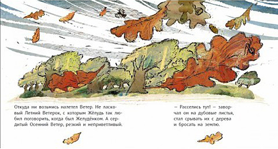 История Желуденка начинается не осенью, а летом. Маленький зеленый желуденок в шапочке живет на большом дубе, постепенно растет, а осенью он... просто становится взрослым.