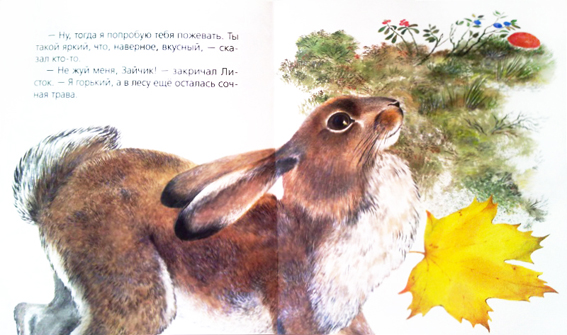Осенью, когда начинают падать листья с деревьев, у зайчихи рождаются зайчата. Осенних зайчат называют листопадничками. Трогательная история про маленького зайчонка, решившего побежать вслед за журавлями в теплые края. Иллюстрации Е. Чарушина очень теплые, обворожительные.