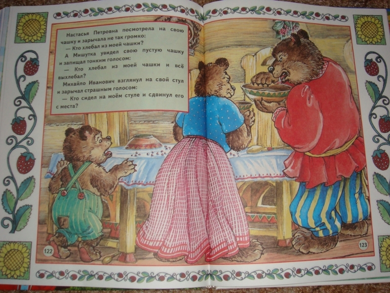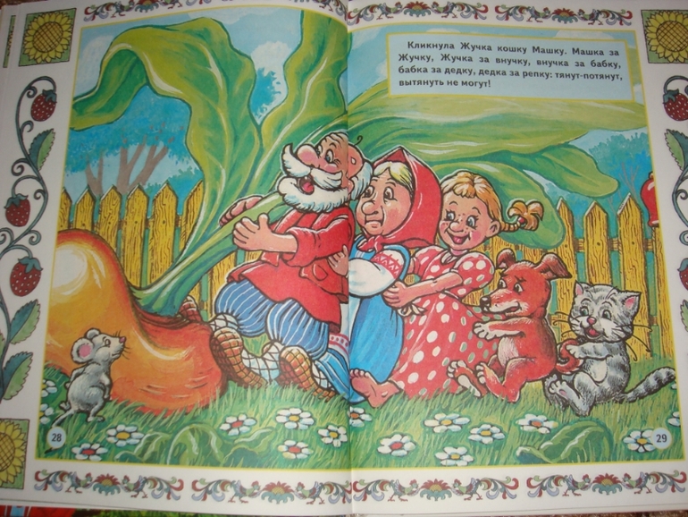 Но что меня привлекло в этой книге - это иллюстрации! Художники Ирина и Александр Чукавины постарались на славу, такого отличного оформления я давно не видела! Каждый рисунок отражает содержание страницы.А например сказка Курочка Ряба занимает в книге аж три разворота. Т.е ребенок видит все,то о чем ему читает мама.