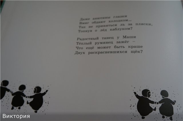 У книги горизонтальная ориентация, открывается как альбом для рисования. С правой стороны иллюстрация на всю страницу, а с левой - 2 четверостишия на белом фоне и завораживающие танцующие тени.