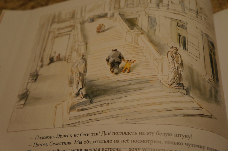"Давным -давно, холодным пасмурным днем одинокий медведь по имени Эрнест подобрал на пустынной улице подкидыша - крошечную мышку селестину и принес к себе в дом....