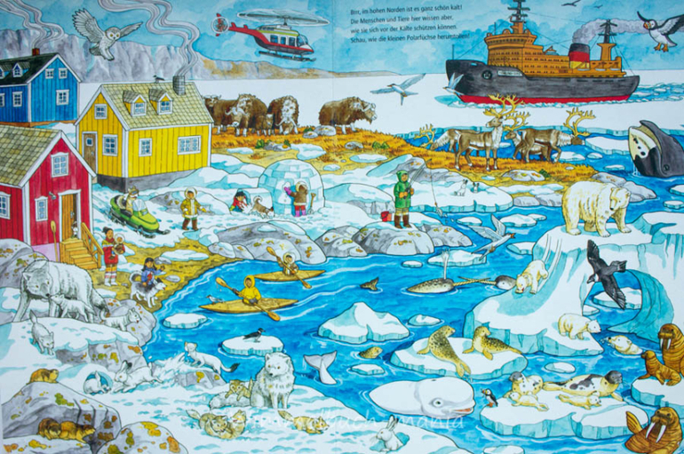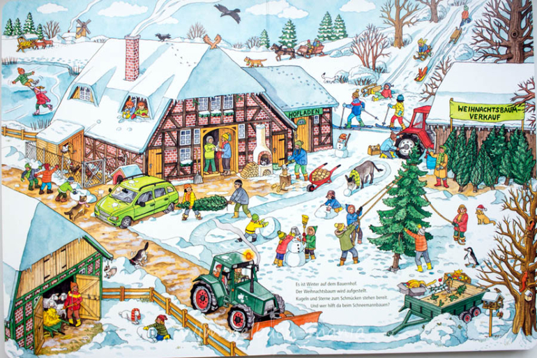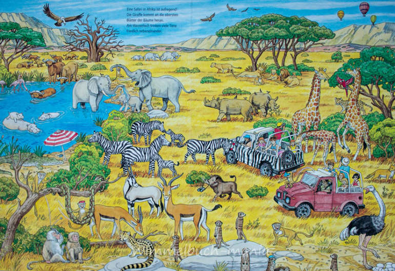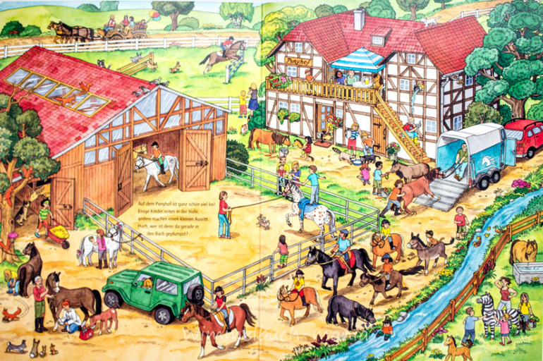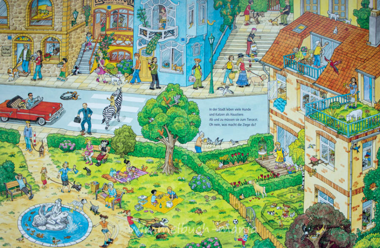 Юмор автора порой специфический,но деткам весело подмечать смешные ситуации. Характер рисунков позволяет показывать эту книгу и начинающим любителям виммельбухов.