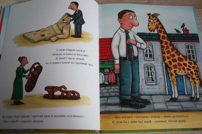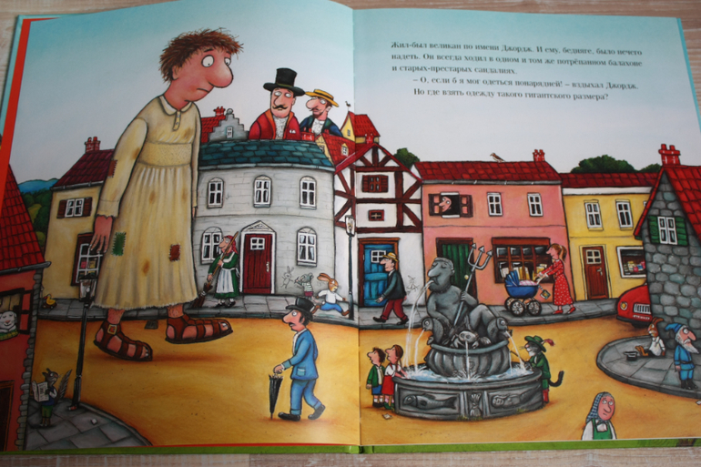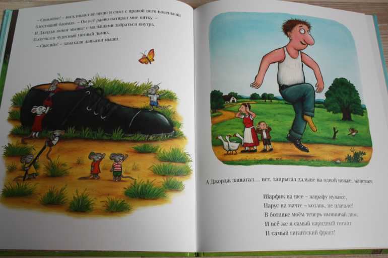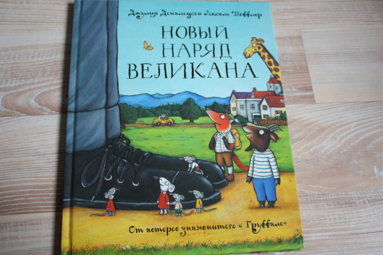 На данный момент,эта книга последняя из имеющихся и обожаемых из Дональдсон. Покупала еще Тимотти Скота,Улитку и кит-первый совсем не пошел,передарила,вторая-читаема,но не обажаема.Планирую из всей серии купить еще Зайчика-сочиняйчика,Человеткина,Дочурку Груффало и все.Эта более мальчишеская ,по-моему. Про великана,который в новом магазине для великанов приоделся,но по пути домой раздал зверям свои обновки для спасения,за что они его отблагодарили.