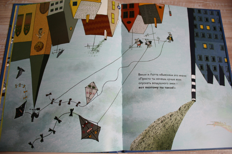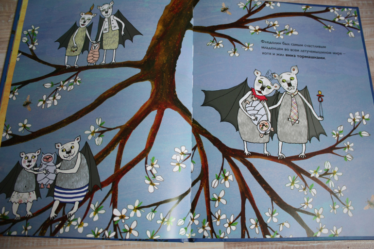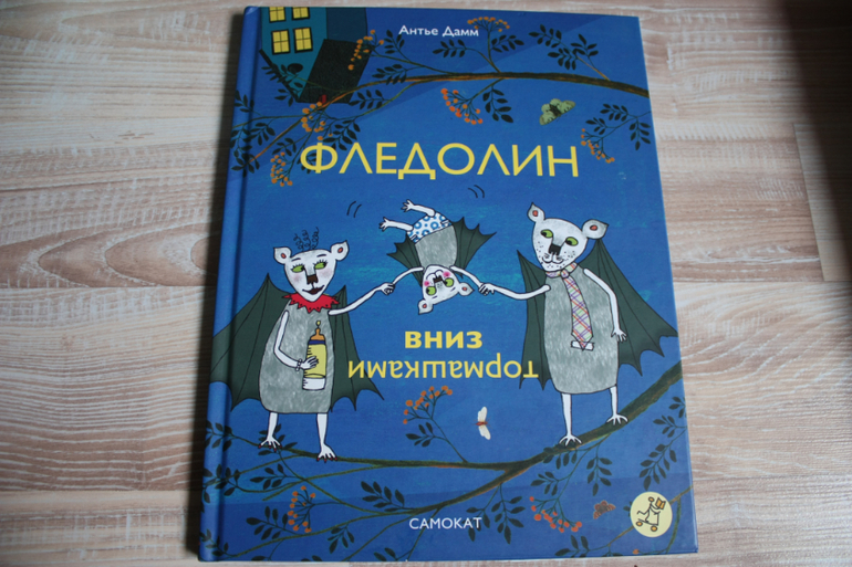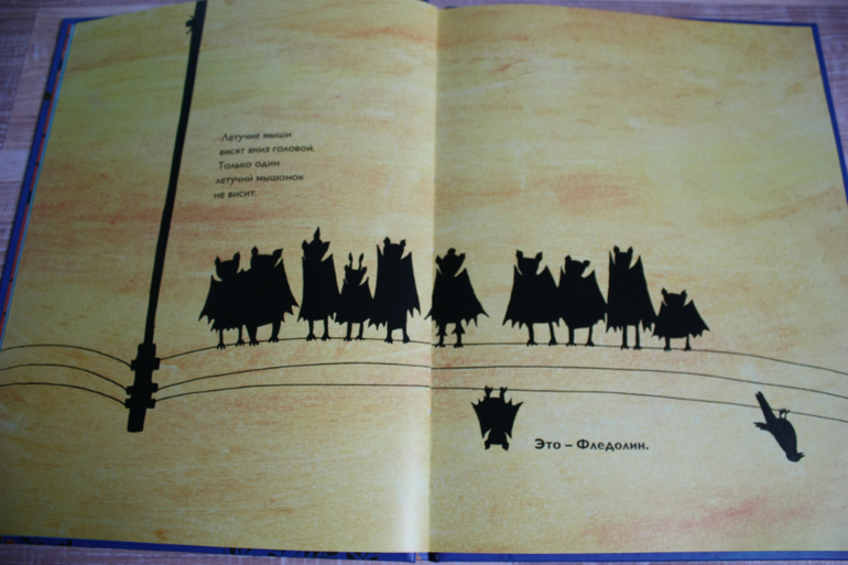 Книга так сверстана,что текст читаем ,когда главный герой перед нами вниз головой,но при этом весь нарисованный мир перевернут.Вертим и так,и так))Фледолин-летучая мышь,которая не висит вниз головой,но в этом есть плюсы.Например,он видит,когда на стаю летучих мышей охотиться лиса и предупреждает своих сородичей.