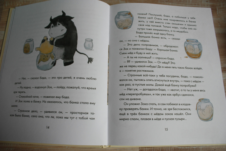 Это наше нынешнее чтение.Книга 4+,можно сказать первая сложная.Здесь картинки не иллюстрируют каждый шаг героев,но они красивые акварельные и много на весь разворот.Есть сложная игра слов,понятная полностью наверно действительно после 4,а то и старше-подмена букв и словотворчество,дающее новый смысл словам.Но,сами истории настолько веселые,простые,что сын просит читать ее вот уже неделю с дня покупки по два раза в день,несмотря на то,что это новый формат чтения для него-без слежки по картинкам.А еще муж ложиться слушать про Зоков,такая семейная книжка получилась.