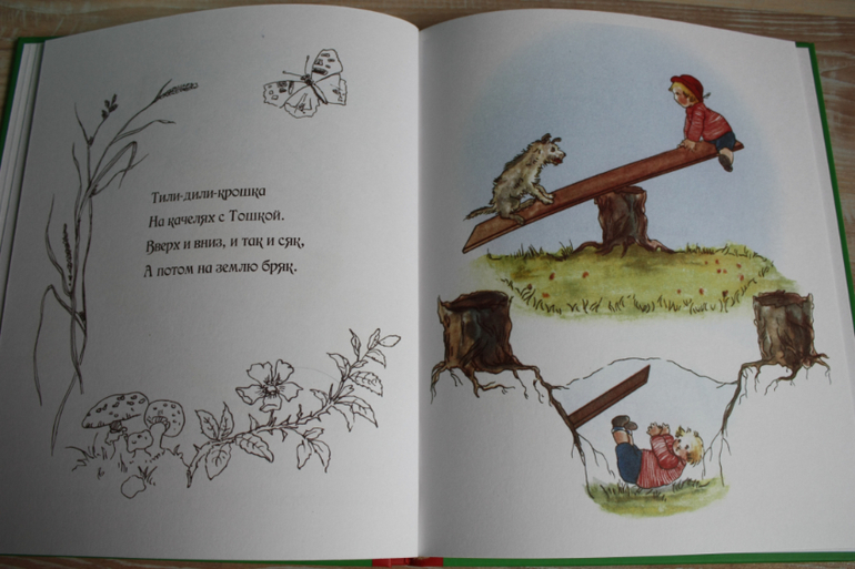 Книга покупалась в подарок годовалой подружке-потешные четверостишья ведь.Но сын строго решил ,что нужна самому. Умиляется ляльке на картинках,которая стоит в кроватке,кушает,катается на качельке.Стихи очень простые для запоминания.
