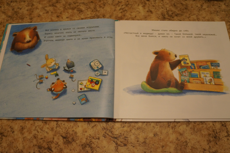 Чудесная небольшая сказка. Добрая и малышковая. Картинок много, красочные, детские и крупные. Очень полезная книга для маленьких деток. Легко объяснить как себя чувствуют детки, если их не принимают в игру и не хотят дружить.