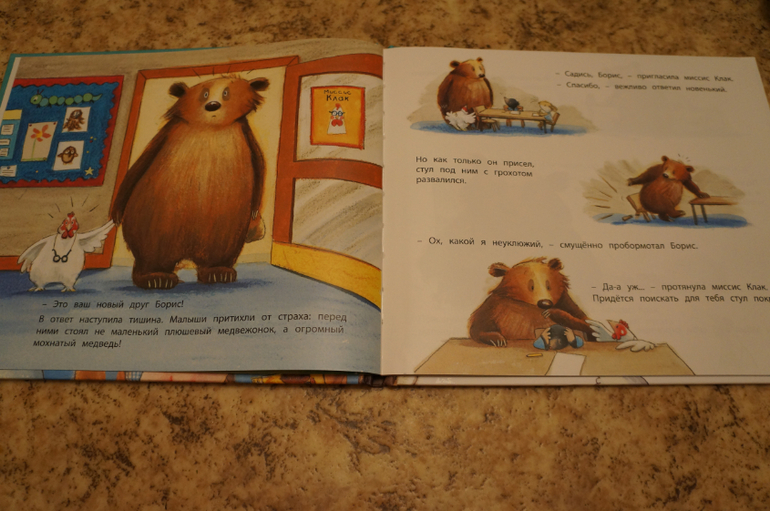 История о медвеженке Борисе, котрый пришел в школу. Но остальные ученики испугались его внешнего вида и размеров и не принимали в свой коллектив. Борису было неуютно и грустно, ему так хотелось завести новых друзей. Однажды Борис ( сам того не подозревая) спас своих маленьких одноклассников от банды крыс. И с тех пор его жизнь изменилась - с ним хотели дружить. играть и сидеть рядом.