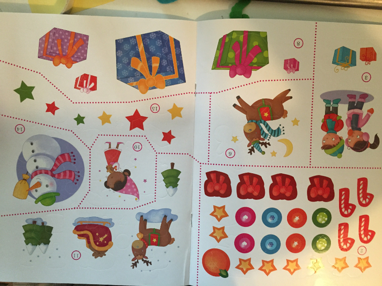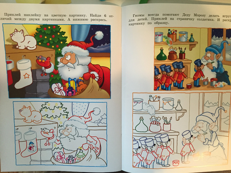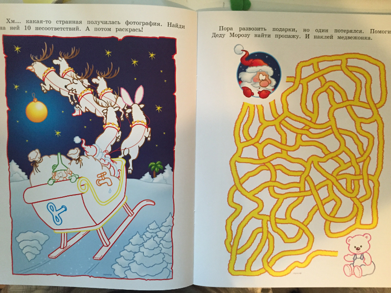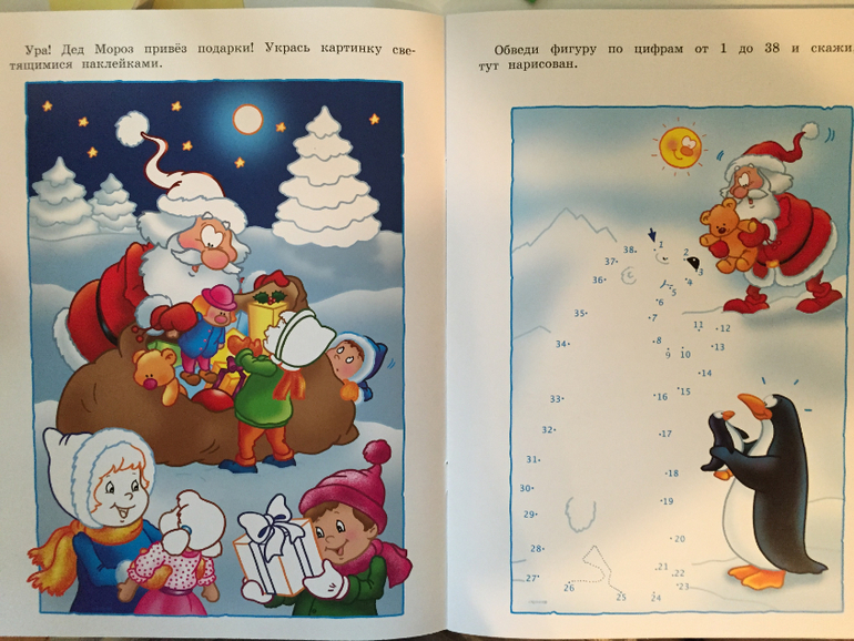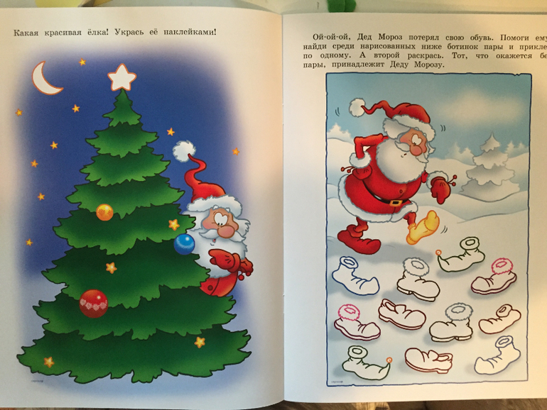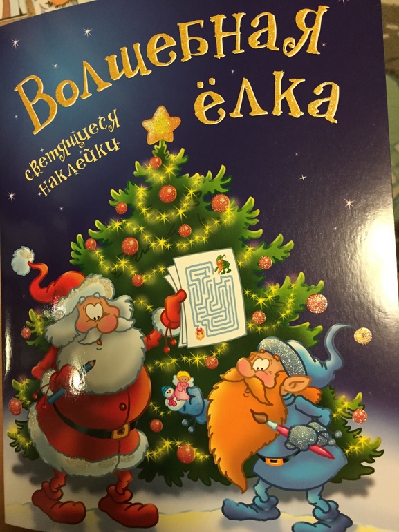 Альбом формата А4, мелованная обложка. Большое количество заданий для детишек, порадовало, что часть заданий может выполнить и мой ребенок (1 г 10 мес): наклеить наклейки на елку, найти нужный башмачок деду морозу, но их всего 2-3. Остальные задания для детей ближе к 3м годам. Хотя на обороте книги указан 0+. Купила из-за светящихся наклеек