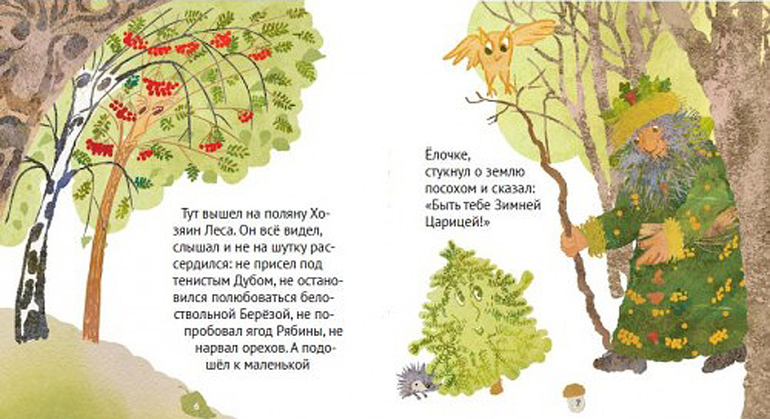 "Весь лес был в снегу, а снег все падал и падал, и казалось, никогда уже не будет ему конца. Было так красиво, что Ежик с Медвежонком вертели головами во все стороны и не могли наглядеться… Пахло снегом и новогодней елкой, внесенной с мороза, и запах этот горчил мандариновой кочкой…"