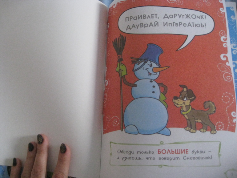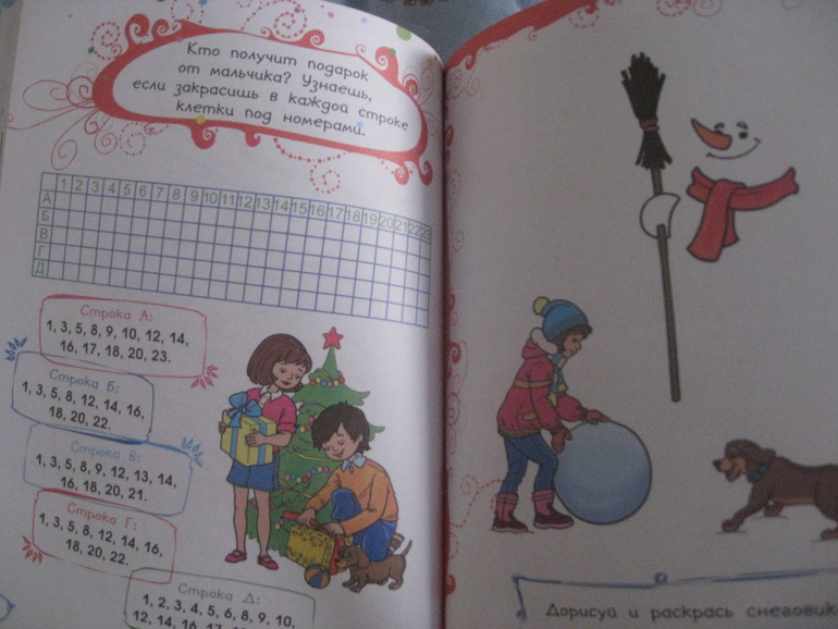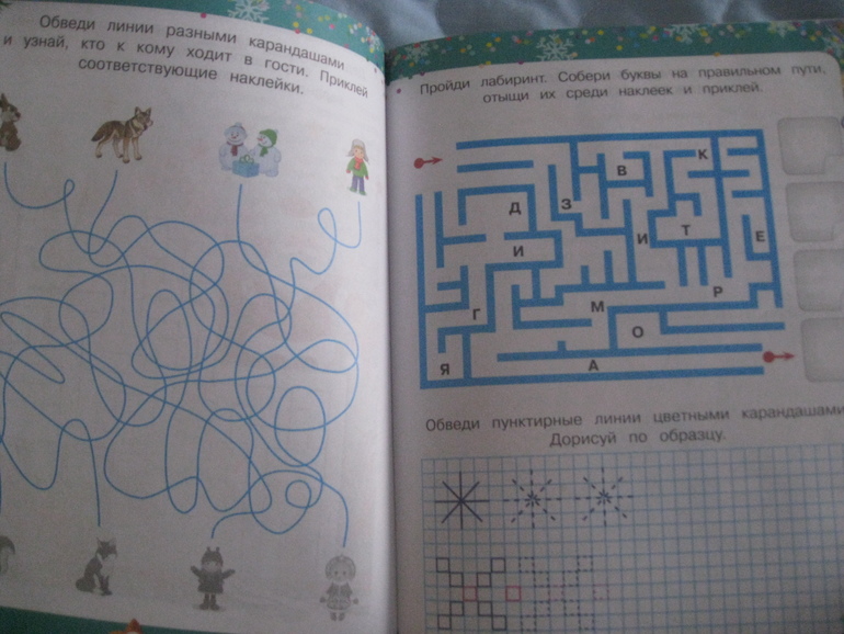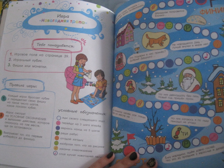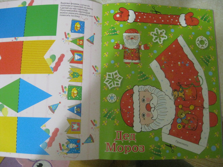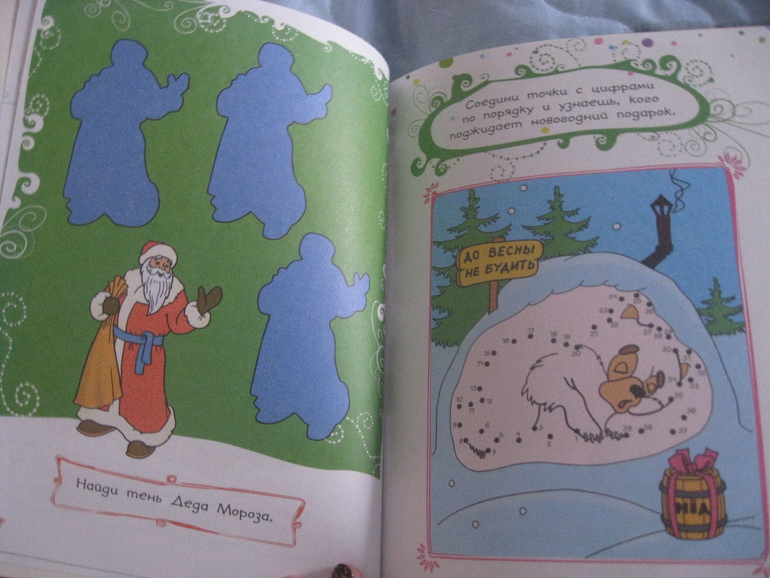 1) "Новогодняя книга игр и загадок"(Махаон). Бюджетная книжка, яркая, плотная бумага, множество заданий - лабиринты, задания с буквами (составить слово, вычеркнуть лишнее), дорисуй, раскрась, отыщи и т.д. А так же "в комплекте" бланк письма ДМ сразу с конвертом, маска, настольная мини-игра-ходилка, 2 открытки, материал для изготовления гирлянды "цепочка". Всего 48 страниц.