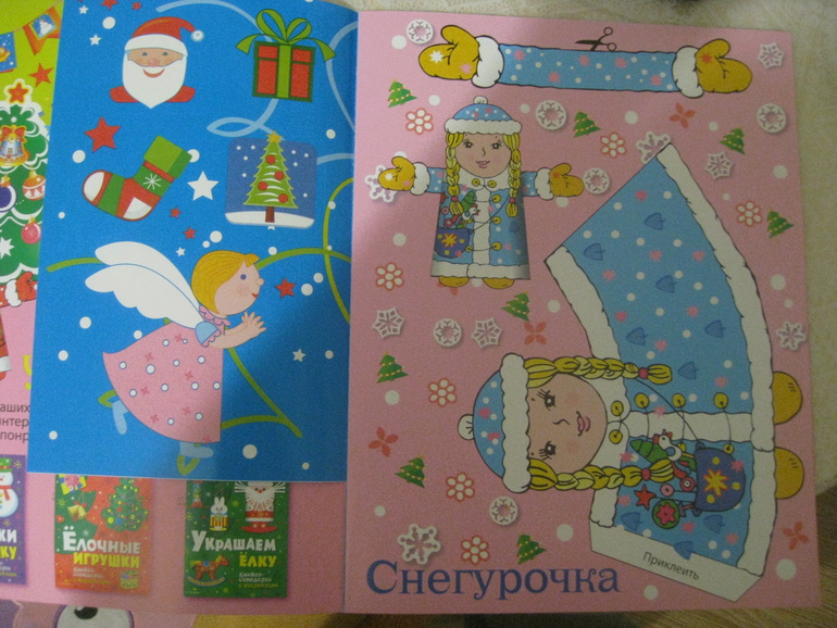 4) Наборы от "Стрекозы" для изготовления ёлочных украшений. Если не ошибаюсь, в серии их 4 шт. Поделки не дублируются. Отличное качество - мелованная бумага, всё очень яркое, наклейки в комплекте (куда ж без них))). Остается только вырезать и клеить. Из одного набора получается где-то 5-6 украшений-игрушек.
