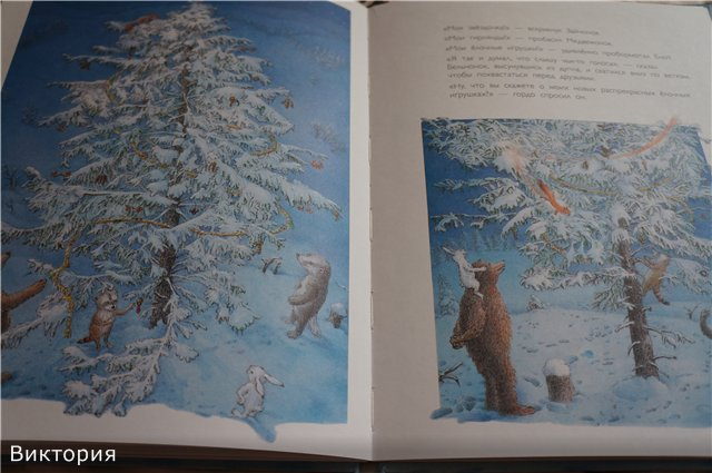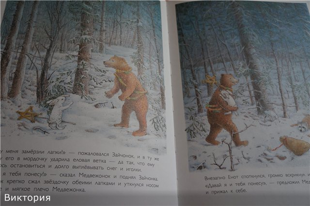 Иллюстрации в пастельных тонах. Мало текста, есть развороты, где буквально 2-3 строчки и большие картинки на целые страницы или две. Короткая и добрая история о Медвежонке, Еноте. Зайчонке и Барсучонке. Моралью которой является, то что Рождество с лучшими друзьями - самый чудесный праздник (даже без подарков).