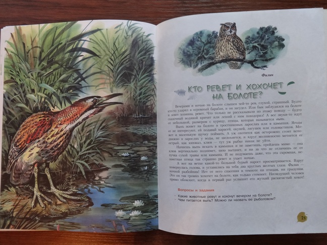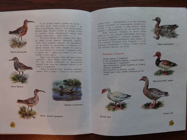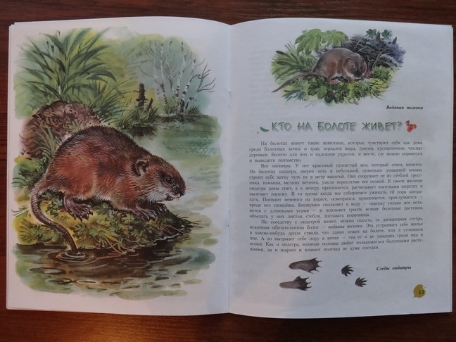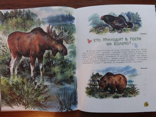 Следующие две книги я бы отнесла на старший дошкольный возраст. Мы их больше смотрим, чем читаем, хотя отдельные абзацы я зачитываю. К примеру, из книги "Кто на болоте живет?" читаю про болото, про некоторые растения (не все) и немного про животных, а вот про торф пропускаю - это дочке совсем неинтересно. После каждой главы есть вопросы, чтобы проверить, как усвоен материал. Ксюша почему-то на вопросы по тексту никогда не отвечает (или говорит "не помню"), даже по художественному. Поэтому я не задаю. Я рада, что дочка вообще слушает хоть немного )).