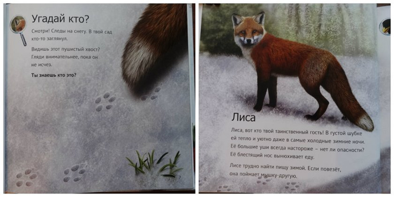 Очень легко подана информация (хотя ее и мало), есть визуальный ряд - животное, следы лап, следы деятельности, и главное игра - угадать по следам или виднеющейся частичке тела, кто прячется. Дочка действительно заинтересовалась. С первого раза не всех получилось угадать )). Теперь она, конечно, уже знает, кто прячется на каждой страничке, но листает книгу и "угадывает" с неменьшим удовольствием.