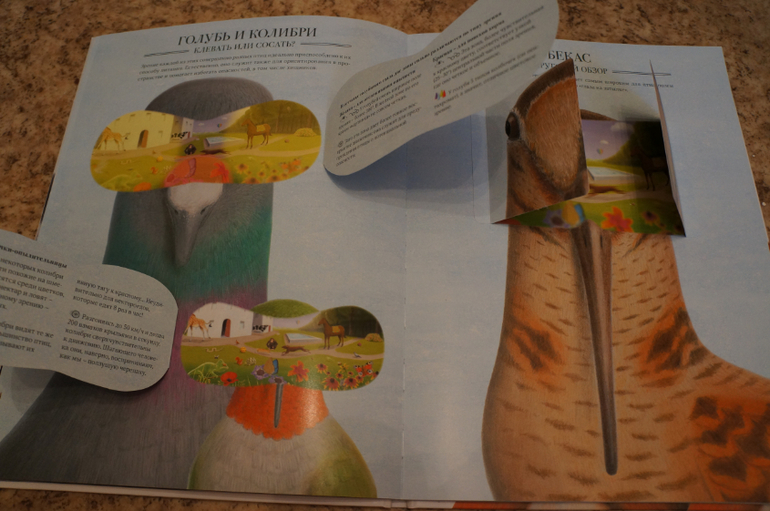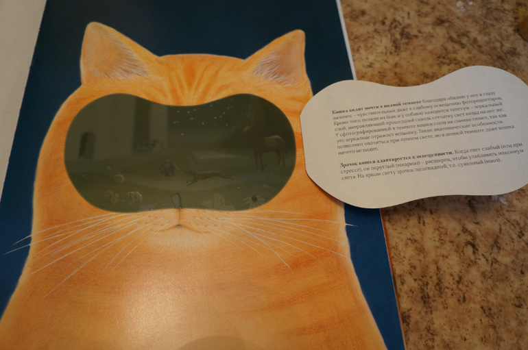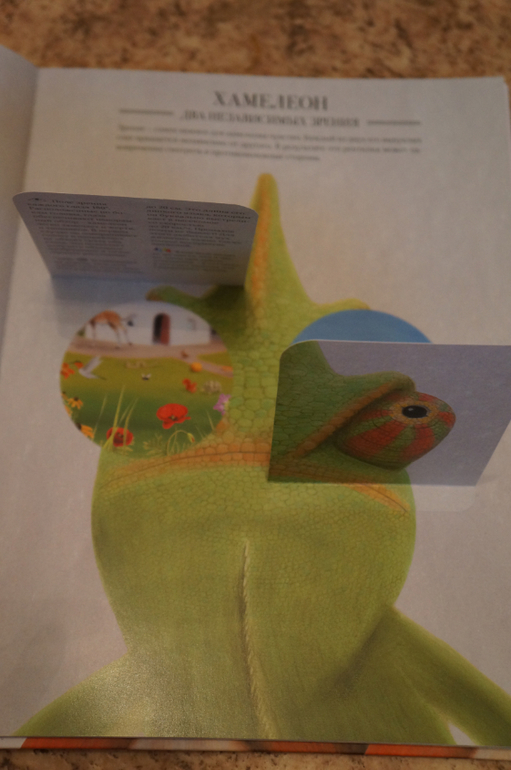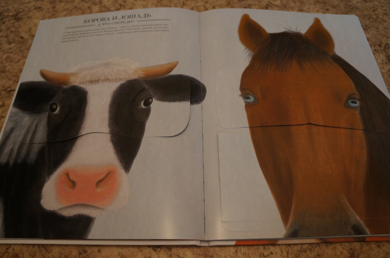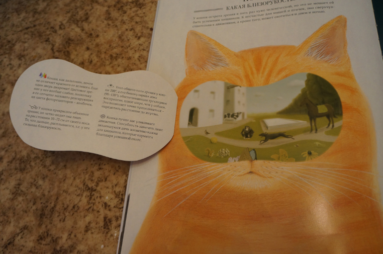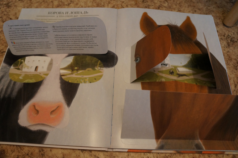 В книге 20 животных: млекопитающие, насекомые, рептилии, амфибии и птицы. Есть большая картинка на 2 листа и показано как ее видят разные животные. Бонусом идет картинка глазами человека днем и ночью.
