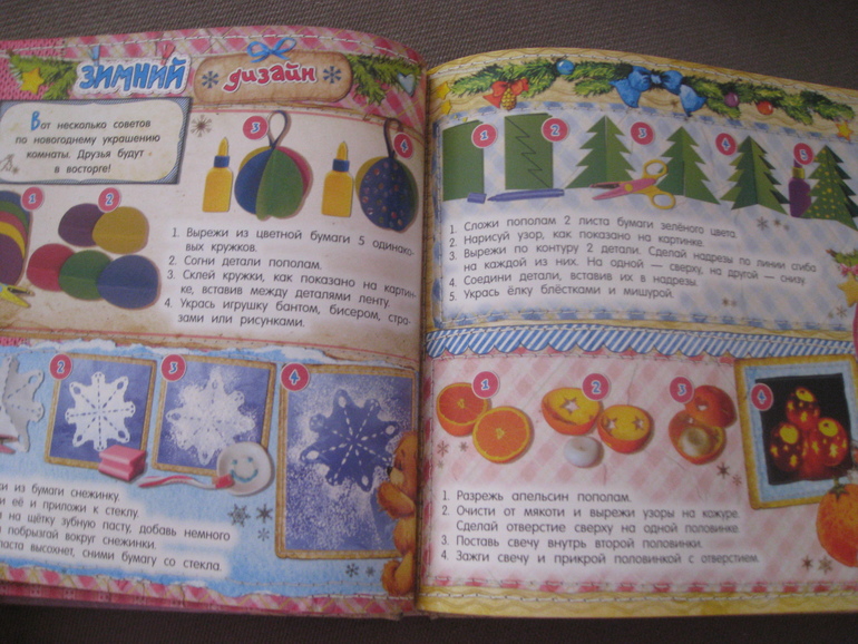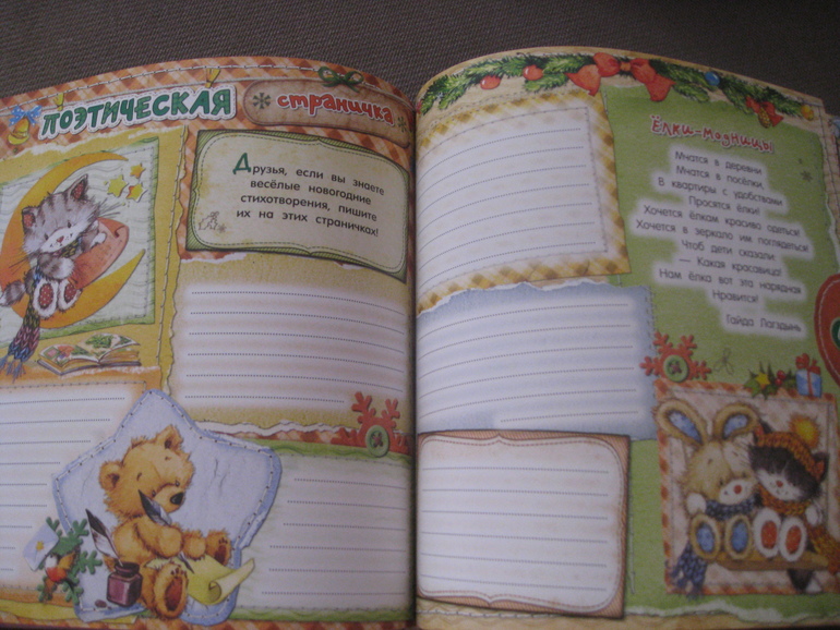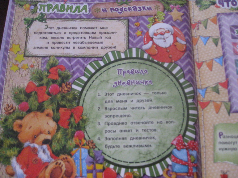 1)"Новогодний дневничок". Мы с подругой очень ждали эту книгу, т.к. подарить в соответствии с ее идеей нужно заранее. Книга предназначалась племяннице 9-ти лет и очень понравилась. Такая девочковая-девочковая. Для любительниц посидеть за письменным столом в зимний вечер, помечтать, порисовать, пописать, поведать что-нибудь дневничку. Качество отличное, страницы плотные, иллюстрации достойные. В книге странички для заполнения: новогодние впечатления, воспоминания, подарки, меню и т.д. А так же рецепты, "девочковые" тесты, идеи для новогодних поделок, гороскоп, гадания, стихи, а в конце 20 страниц для "новогодних анкет друзей". Эх, как хочется вернуться в детство, да с таким дневничком козырнуть в школе)))