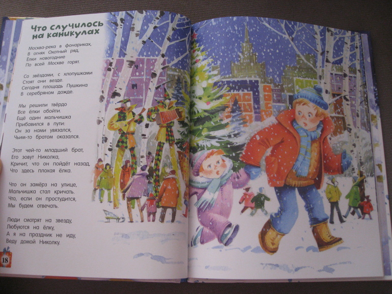 Я очень пожалела, что купила только в подарок, а на себе сэкономила) Книга на все времена, станет украшением детской библиотеки и отличным подарком и малышам, и деткам постарше. Всё на высоте - оформление, иллюстрации - большие, на весь разворот, стихи, которые мы все помним и любим. Берешь в руки и возвращаешься в свое советское детство) По большей части в книги зимние и новогодние стихи, но есть 2 или 3 "незимних"))) Мой старинный фотоаппарат совсем не передает всей красоты иллюстраций и оформления.