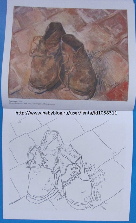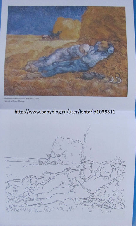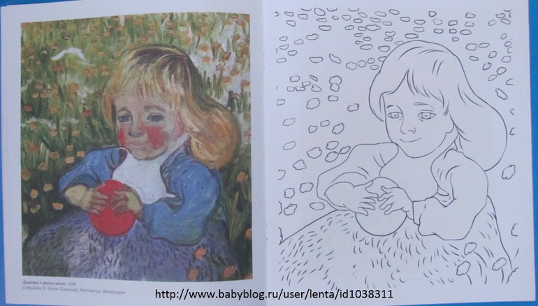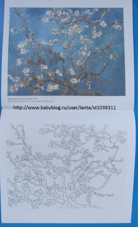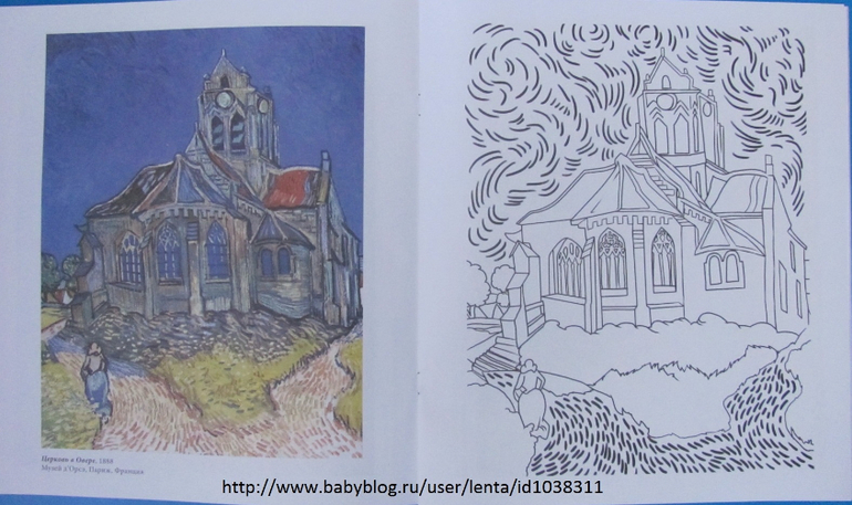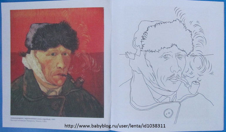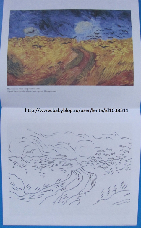 Представляет собой альбом с репродукциями картин Винсента Ван Гога, и дается контурное изображение для раскрашивания. Увеличенный квадратный формат, мягкая обложка, плотные листы. Всего 27 картин.