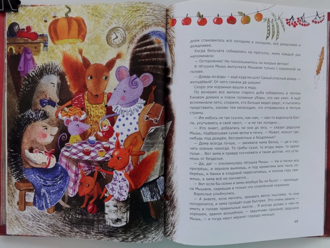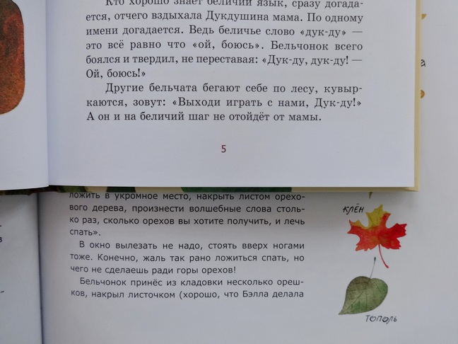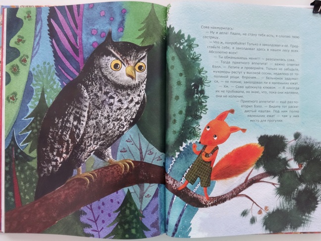 Честно говоря, и мне эта затянутость не слишком нравится. Если "отжать" из сказки немного лишних рассуждений, она от этого ничего не потеряет. Длинно - не всегда хорошо. Кажется неоправданной современная техническая оснащенность героев - лесные жители звонят друг другу по телефону, но при этом у них нет фонариков - им светят светлячки. Главный герой - бельчонок Бэлл - меняется на протяжении сказки (как и в случае с Дук-ду), но тут этот процесс и его причины не такие явные, маленькому ребенку уловить трудно. Но выводы тоже можно сделать хорошие: если в начале бельчонок просто привязан к своей волшебной книге, мечтает с помощью нее изменить себя и мир вокруг, то в конце у него все получается сделать самому, без книги, причем все выходит даже лучше.