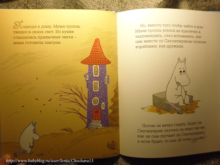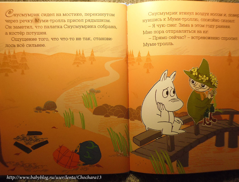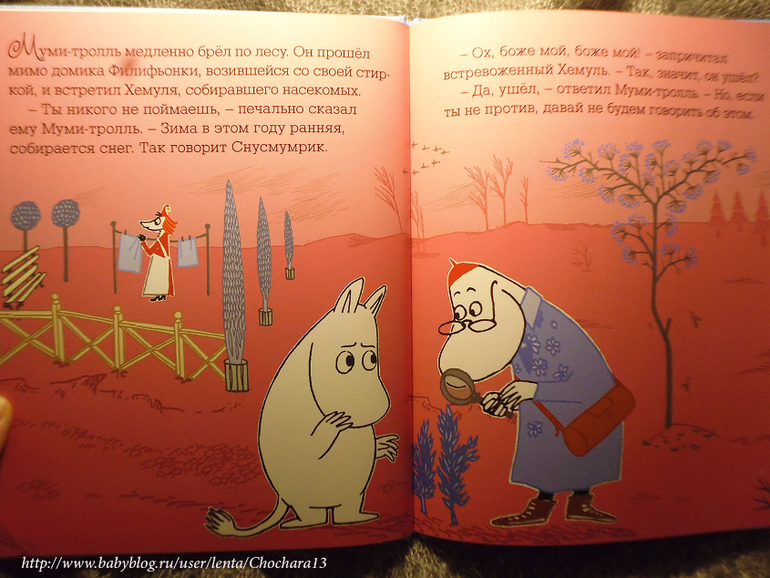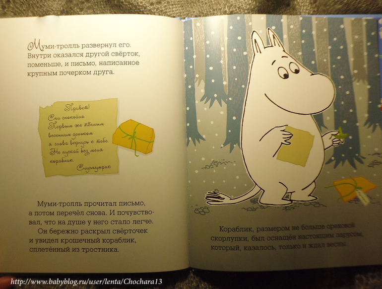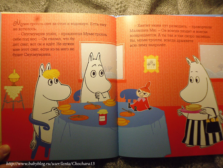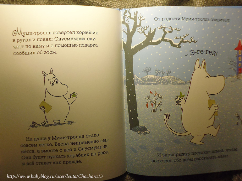 С помощью этой книги я поняла, что моя дочь готова к миру Муми-троллей! Прочитав ее, дочь попросила - "Еще историю про Муми-тролля!". Она очень любит мульт-трилогию "Все дело в шляпе", "Лето в Муми-доле" и "Осень в Муми-доле", после которых бегает в шляпах и кричит - "Мама, ты меня узнаешь?" Но читать толстенную книгу "Все о Муми-троллях" я пока не решалась. Уж больно много там текста, мало картинок, а самое главное - много смысла! Мы обязательно будем читать эту книгу, но позже. А сейчас - вот такие короткие и адаптированные для малышей книжки с яркими иллюстрациями - самое подходящее. Смысла там пусть не так много, но волшебную атмосферу Муми-жизни они уже передают, а главное, содержание простое, доброе и обнадеживающее. Эту книгу хорошо читать в конце зимы, когда очень-очень хочется, чтобы наконец-то пришла весна! А еще там довольно крупный шрифт и он подойдет для самостоятельного чтения младших школьников.