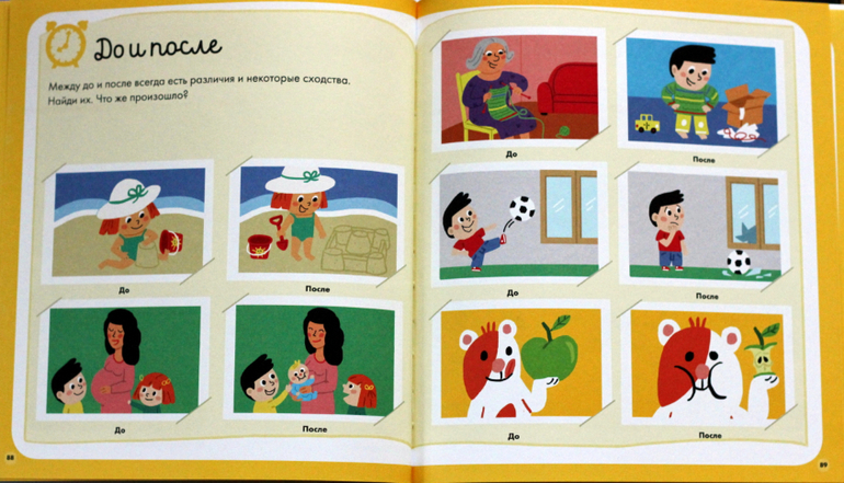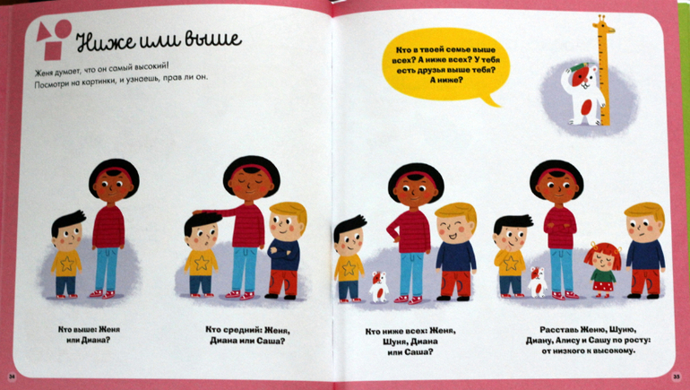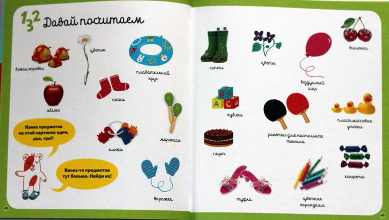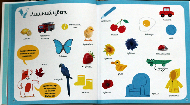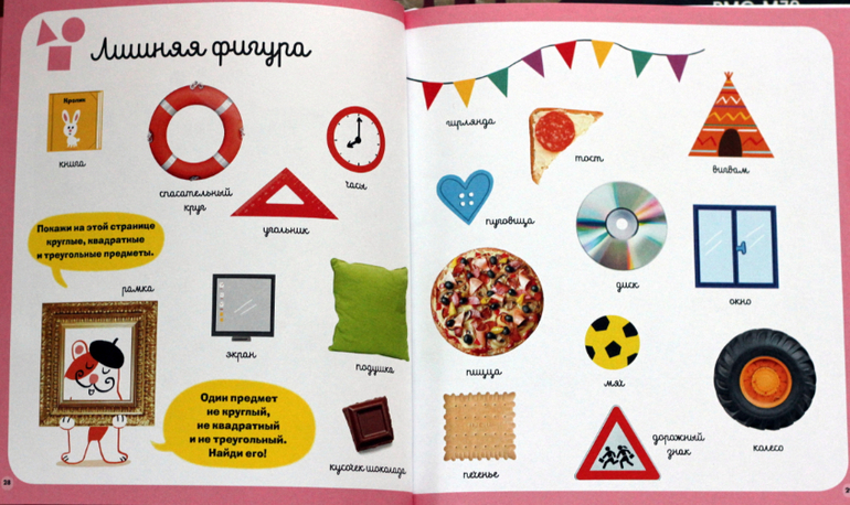 В книге есть несколько разделов: "цвет", "формы и размеры", "цифры", "речь", "где и когда" и разнообразные задания по каждой теме. Типы заданий повторяются в каждом разделе. При этом есть очень интересные странички, например, предлагаются не только обычные геометрические формы, но и формы листьев, есть приветствия на разных языках, разные знаки в бассейне, поиск цифр на улице, оттенки цветов - мой ребёнок в восторге от таких заданий. Много всегда вызывающих интерес "находилок" (нужно на большой общей картинке найти разные предметы, вынесенные вниз или вбок), заданий типа найди одинаковое, найди лишнее, найди пары и разные другие...