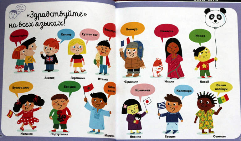 Малышам от 0 до 3Разнообразных "книг малыша" не так уж мало, но, честно говоря, мне их читать обычно скучновато. На этом фоне очень порадовала новая книжка известных экспериментаторов - издательства Клевер - "Я познаю мир", которую я собираюсь подарить ребёнку подруги, но решила до этого поделиться с человечеством :) С одной стороны, в ней есть всё, что "положено": цвета, счёт и проч. Но задания сделаны поинтереснее, чем обычно, и есть разные совсем нестандартные странички (например, приветствия на разных языках). Самый подходящий возраст, мне кажется, примерно с 2 до 3 лет, хотя некоторые разделы очень заинтересовали и моего ребёнка в его 3,5 и были для него не очень простыми. Под катом подробности и много-много разворотов.
