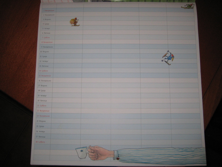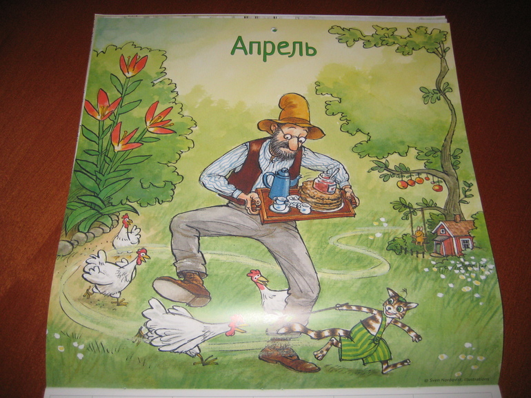 Календарь производит исключительно позитивное впечатление: большого размера, на мелованной бумаге, печать не резкая, не контрастная, забавные рисунки, все эти вмешивающиеся в ваши планы существа: то Финдус пробежит, то мюкла, то курицы... :)