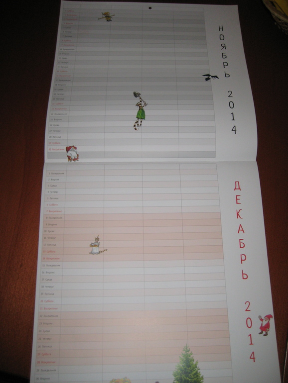 Еще за месяц до Нового года мы обзавелись новым календарем :) Что же здесь необычного? - скажете вы. А то, что это не просто календарь с изображением родных просторов, моря или гор, а настоящий семейный планер, куда можно довольно крупно и наглядно вписать все семейные торжества и иные важные события, напоминать о которых будут два любимца детей и взрослых - Финдус и Петсон :)