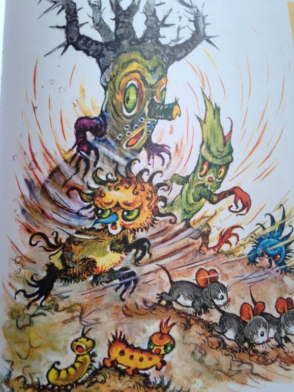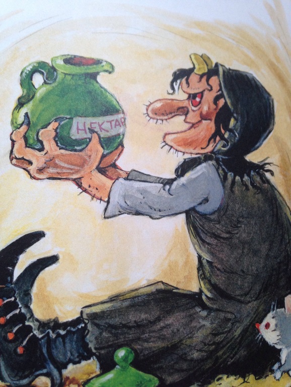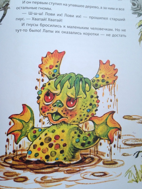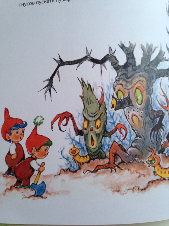 Сама история полна экшна, нам понравилась. Ведьма ворует у гномов их волшебные атрибуты, и те идут бороться с ведьмой, ее побеждают. После первого прочтения бояться перестал- добро восторжествовало!