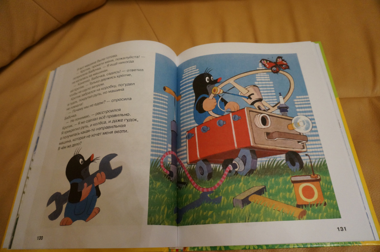 3) Кротик большая книга Майшоп Книжка очень хорошая, появилась у нас в 2 года (нам 2,1), сразу заинтересовал рассказ кротик и автомобильчик, другие прочитали по разу и все. Читал пару недель, заставлял всех читать, рассматривал все запчасти и инструменты, переварил, пока не хочет ее читать. Но думаю у нее еще есть будущее!![]()
