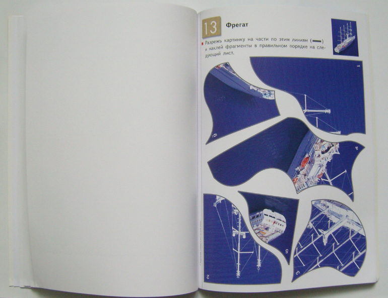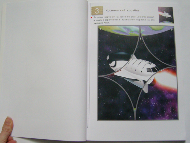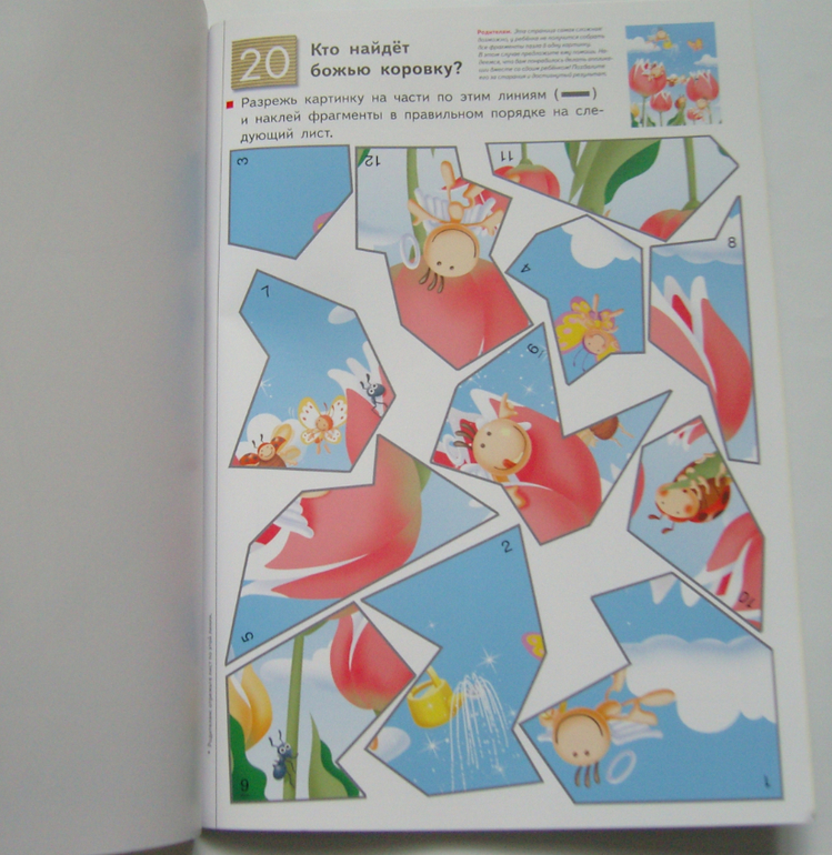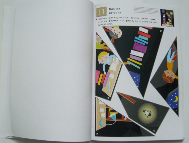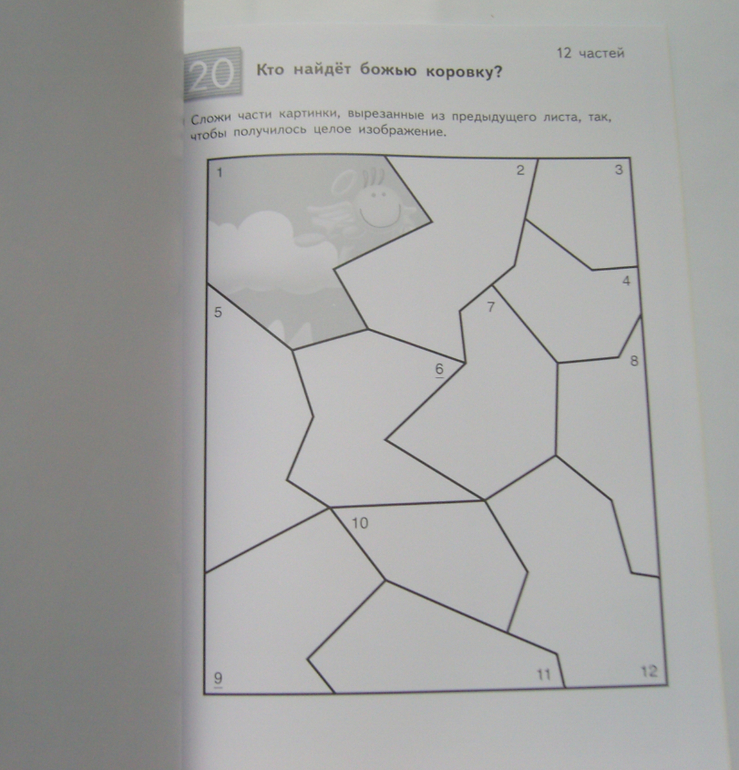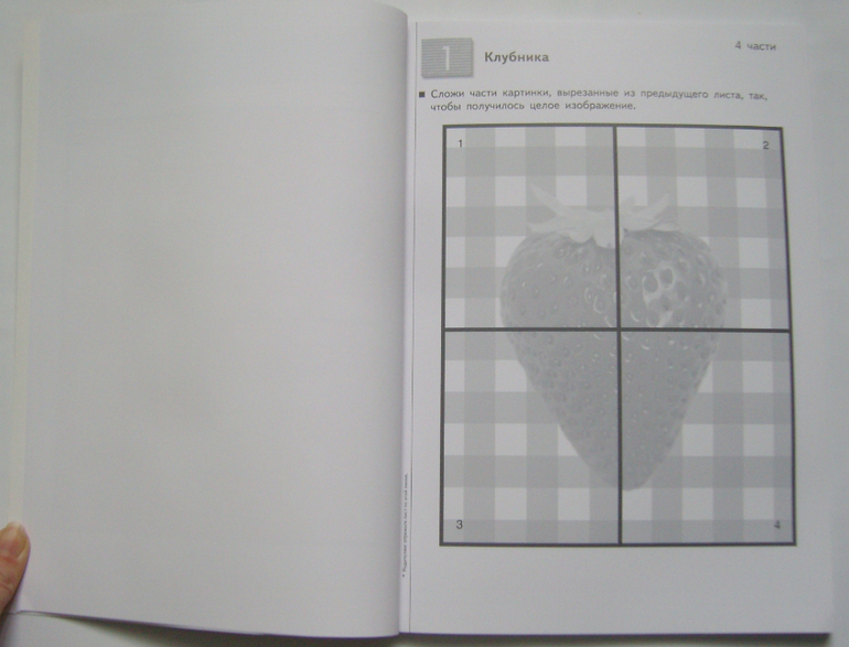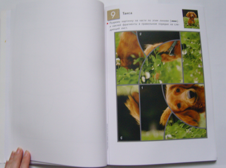 В тетради 20 заданий,на одно задание отведено два листа- на первом листе нужно вырезать детали пазла, на второй лист нужно наклеить эти детали пазла, соединив их в одну целую картинку.