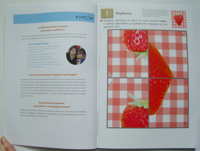 Как и все тетради KUMON, эта построена методом «от простого к сложному», т.е. сначала задания идут простые - четыре части пазла, прямые линии , но с каждым разом задания усложняются, частей пазла становится больше и линии не такие прямые, как сначала)