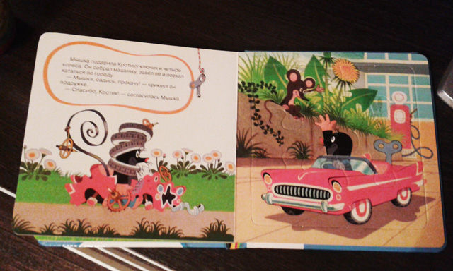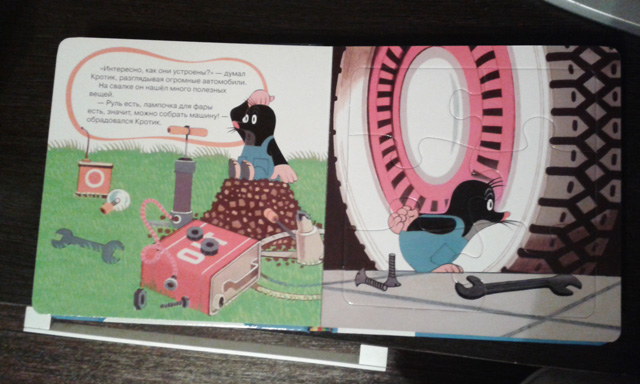 Книжечка мне очень понравилась, обложка на ощупь мягкая, приятная. Внутренние странички из плотного картона с пазлами.
