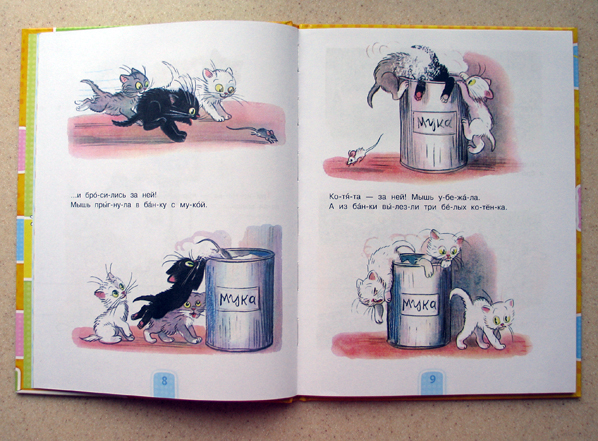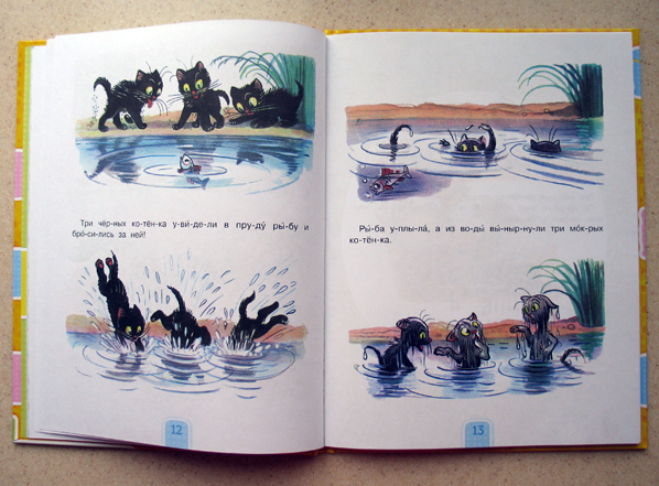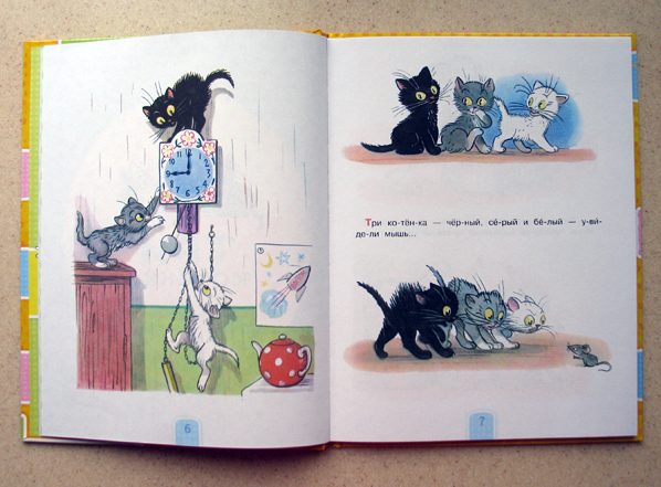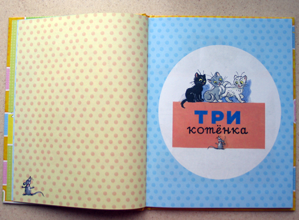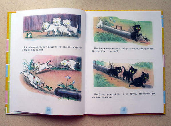 Когда я впервые увидела эту книгу, она мне понравилась сразу! Во-первых, я люблю В.Сутеева и считаю, что его книг много не бывает. Во-вторых, я искала книгу для первого чтения с крупными буквами и словами поделёнными на слоги. В-третьих, мой младший сын, всегда так бережно относящийся к книгам и так нежно любящий котят, вдруг взял и изорвал в клочья наших маленьких "Трёх Котят", что на него нашло я не знаю, может запоздалый кризис 2-х лет.