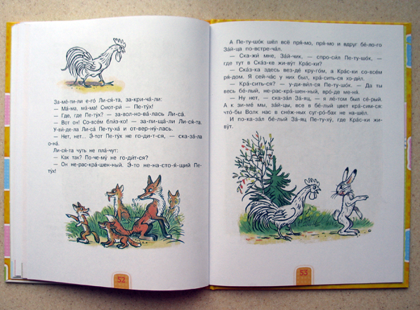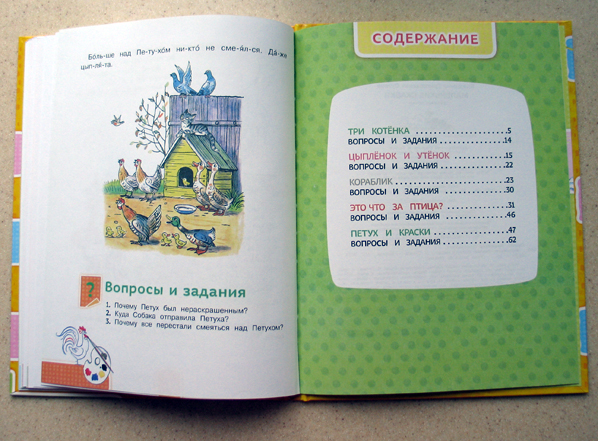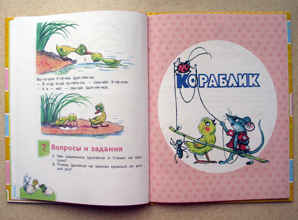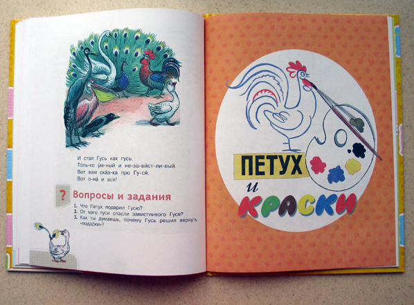 Что мне особенно понравилось, так это то, что текст в книге постепенно усложняется. Да ещё в конце каждой сказки есть вопросы, на которые ребёнок должен ответить. Мы пошли дальше и я ненавязчиво перехожу от вопросов к пересказу. Считаю его очень полезным.
