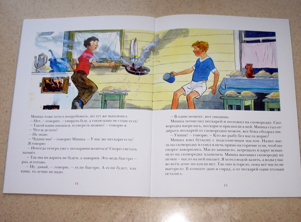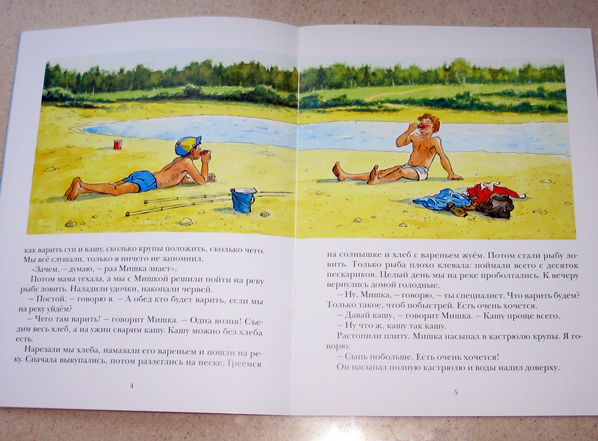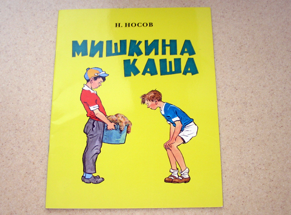 "Мишкина каша" тоже любима и постоянно читаема, ведь главные герои мальчишки! Рассказ о том как два друга, оставшись вдвоём, пытались приготовить кашу. С утра мама им оставила хлеб на два дня, варенье,показала, где какие продукты лежат, объяснила, как варить суп и кашу и уехала (видимо вот почему раньше дети были более самостоятельные). А ребятам было лениво этим заниматься и они пошли на реку рыбу ловить и хлеб с вареньем есть. А когда пришли вечером домой голодные, стали кашу варить. Причем печь старая у них, деревенская, с дровами, как же мне нравится! Налили воды, а вот с крупой переборщили. Каша закипела и полезла наружу. А уже стемнело. И возились они с этой кашей до тех пор пока вода не закончилась, а как закончилась, пришлось в потёмках к колодцу идти. Утопив в колодце ведро и чайник, кружкой кое-как набрав воды, ребята таки доварили кашу. Но съесть её не смогли.