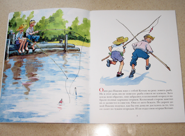 "Огурцы" мы читали уже много раз. И несмотря на это, нисколечко не надоедает! Это рассказ о двух мальчиках Павлике и Котьке, которые забрались в колхозный огород и набрали полные карманы огурцов. Колхозный сторож заметил их и засвистел в свисток, а они от него убежали. По дороге домой Павлик отдал свои огурцы Котьке, так как побоялся что ему достанется из-за того, что он лазит по чужим огородам. А Котька радостный принёс свои огурцы домой и хотел отдать маме, но мама его только поругала за то, что он их украл и велела отнести обратно. Рассказ заканчивается хорошо. Но держит читателя от начала и до конца. Такой динамичный.
