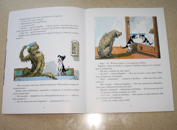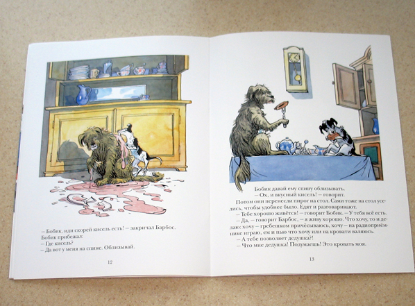 Рассказ о том, что жил был пёс Барбос. У него был друг - кот Васька. Оба жили у дедушки. Когда дедушка ходил на работу, Барбос сторожил дом, а кот Васька мышей ловил. И вот однажды, когда дедушка ушел на работу, а Васька убежал гулять, Барбос пригласил в гости своего приятеля Бобика. И устроил ему экскурсию по квартире, ведь Бобик н разу не был в квартире. Он с удивлением всё рассматривал. Вначале часы, потом увидел гребешок и подумал, что это пила, а Барбос сказал, что это гребешок и научил его причесываться. Потом он заметил зеркало и тоже немало удивился. Затем дело дошло до телевизора и они устроили пляски. Затем решили приятели перекусить, разлили кисель, а наевшись, завалились спать на дедушкину кровать. Не буду рассказывать реакцию дедушки, когда он все увидел.