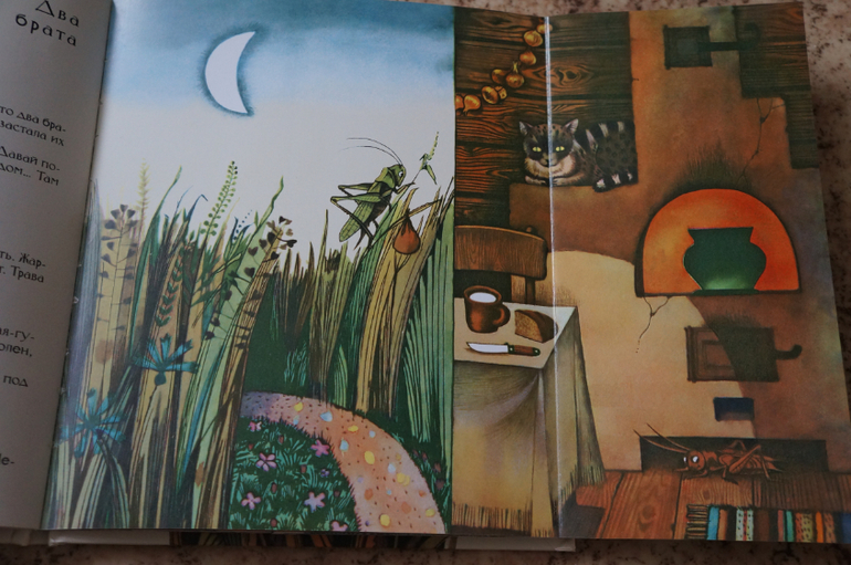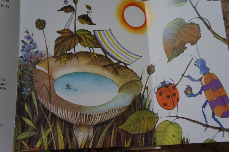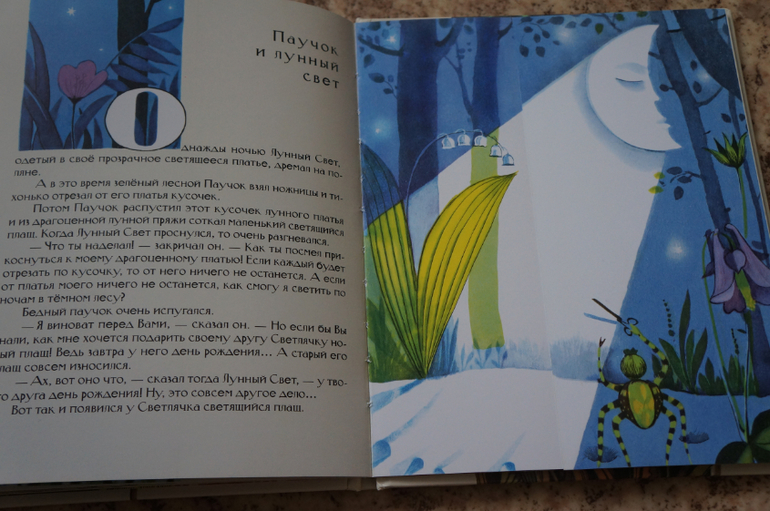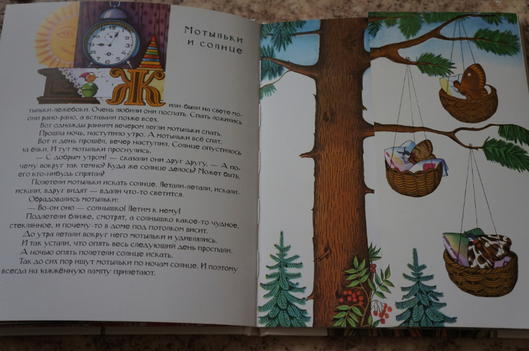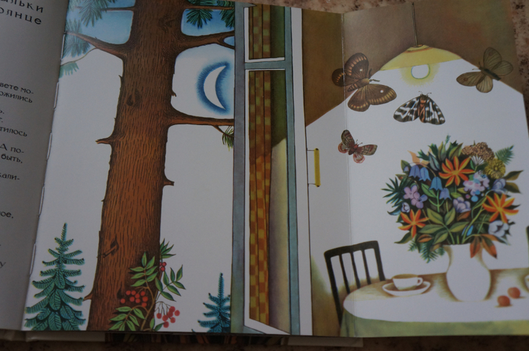 Когда открыла ее, то восхитилась задумкой художника. На каждой странице есть открывающийся клапан. В закрытом виде мы видим иллюстрацию к началу рассказа, а открыв клапан - иллюстрацию к концу истории. Таким образом к каждому рассказу получается 2 полностраничные картинки и 1 на половину страницы. Это очень щедро, учитывая что в каждой истории всего 10-20 строк.