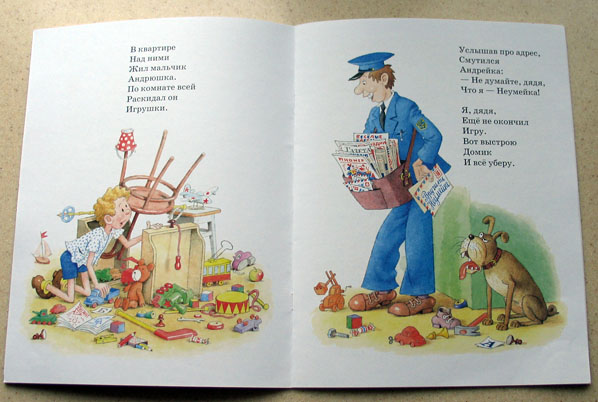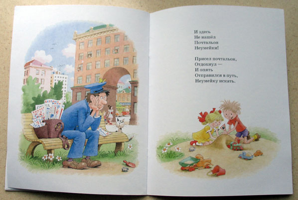 Если в Вашей квартире поселился Великий Нехочуха или Немогука, то Вам срочно нужна эта книга!Очень мне нравится этот добрый стих, да ещё и в иллюстрациях Огородникова. Суть его незатейлива и состоит в том, что на почту поступило письмо, но адрес на нём указан не был. Зато было указано, что данное письмо необходимо вручить некому Неумейке. И почтальон принялся за его поиски. Обошёл он все квартиры и каждый раз, когда он уже думал, что вот нашёл адресата, как оказывалось, что это он нашёл Умейку. Так до сих пор и ищет почтальон Неумейку.
