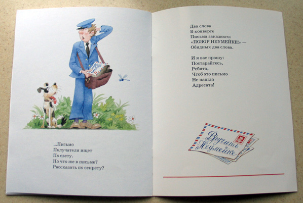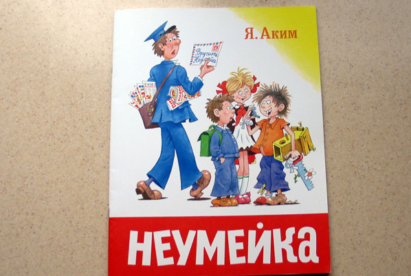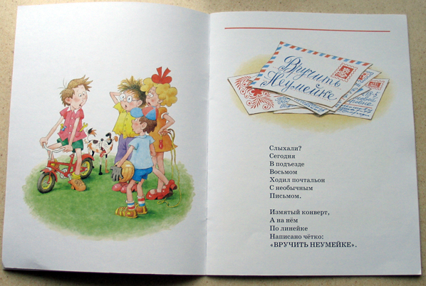 Очень мне нравится этот добрый стих, да ещё и в иллюстрациях Огородникова. Суть его незатейлива и состоит в том, что на почту поступило письмо, но адрес на нём указан не был. Зато было указано, что данное письмо необходимо вручить некому Неумейке. И почтальон принялся за его поиски. Обошёл он все квартиры и каждый раз, когда он уже думал, что вот нашёл адресата, как оказывалось, что это он нашёл Умейку. Так до сих пор и ищет почтальон Неумейку.