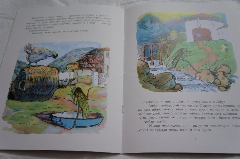 Кузнечик нарвал травку на лугу и обменял ее на молоко. Отдал молоко кошке и договорился с мышами. Получил просо у амбара и обменял его на яичко. Ворон, получив яичко,обещал не каркать на дубу. Дуб в свою очередь дал желудей, а свинья щетинки.